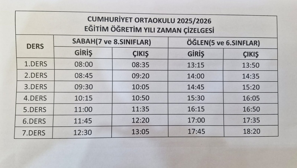 06.10.2025 tarihinden itibaren uygulanacak ders giriş ve çıkış saatlerimiz.